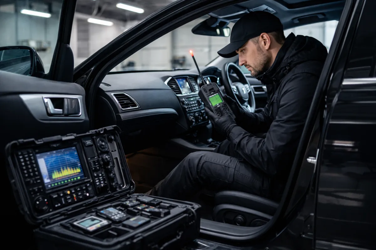 A vehicle bug sweep is a professional inspection designed to detect unauthorised GPS trackers and electronic surveillance devices fitted to a vehicle without the owner’s knowledge.